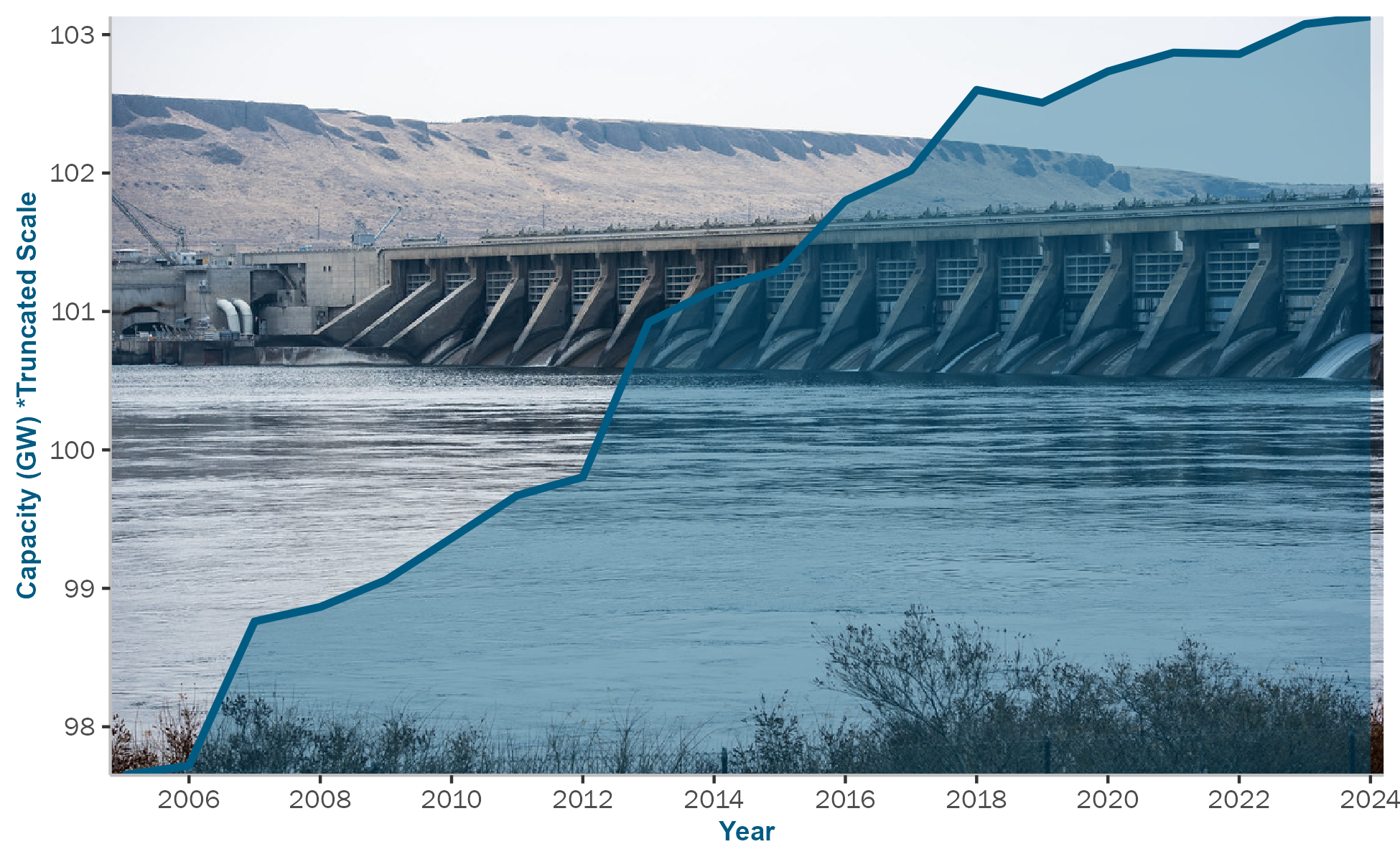 Megan M. Johnson. 2025. Existing Hydropower Assets (EHA) Capacity Plant Database, 2005-2024. HydroSource. Oak Ridge National Laboratory, Oak Ridge, Tennessee, USA. DOI: 10.21951/EHA_Capacity_FY2025/2570858