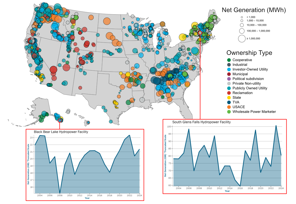 Megan M. Johnson. 2025. Existing Hydropower Assets (EHA) Net Generation Plant Database, 2003-2024. HydroSource. Oak Ridge National Laboratory, Oak Ridge, Tennessee, USA. DOI: 10.21951/EHA_NetGeneration_FY2025/2570860