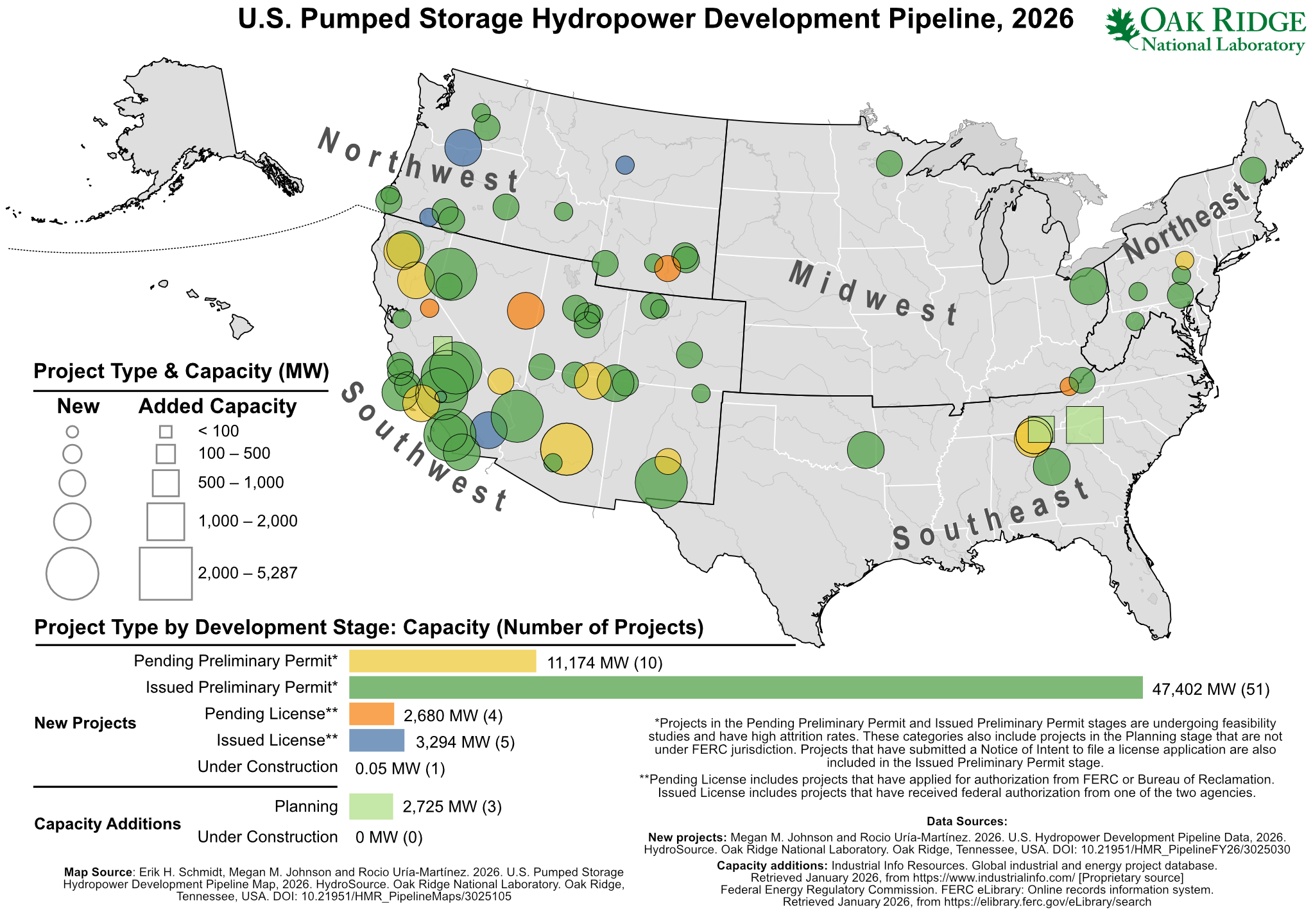 Erik H. Schmidt, Megan M. Johnson and Rocio Uría-Martínez. 2026. U.S. Pumped Storage Hydropower Development Pipeline Map, 2026. HydroSource. Oak Ridge National Laboratory, Oak Ridge, Tennessee, USA. DOI: 10.21951/HMR_PipelineMaps/3025105